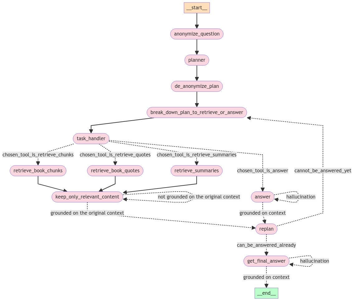 This iterative, multi-faceted approach enables the agent to handle complex queries effectively by breaking them into manageable tasks, retrieving relevant information, and continuously refining its methods until a well-grounded and satisfactory answer is achieved.