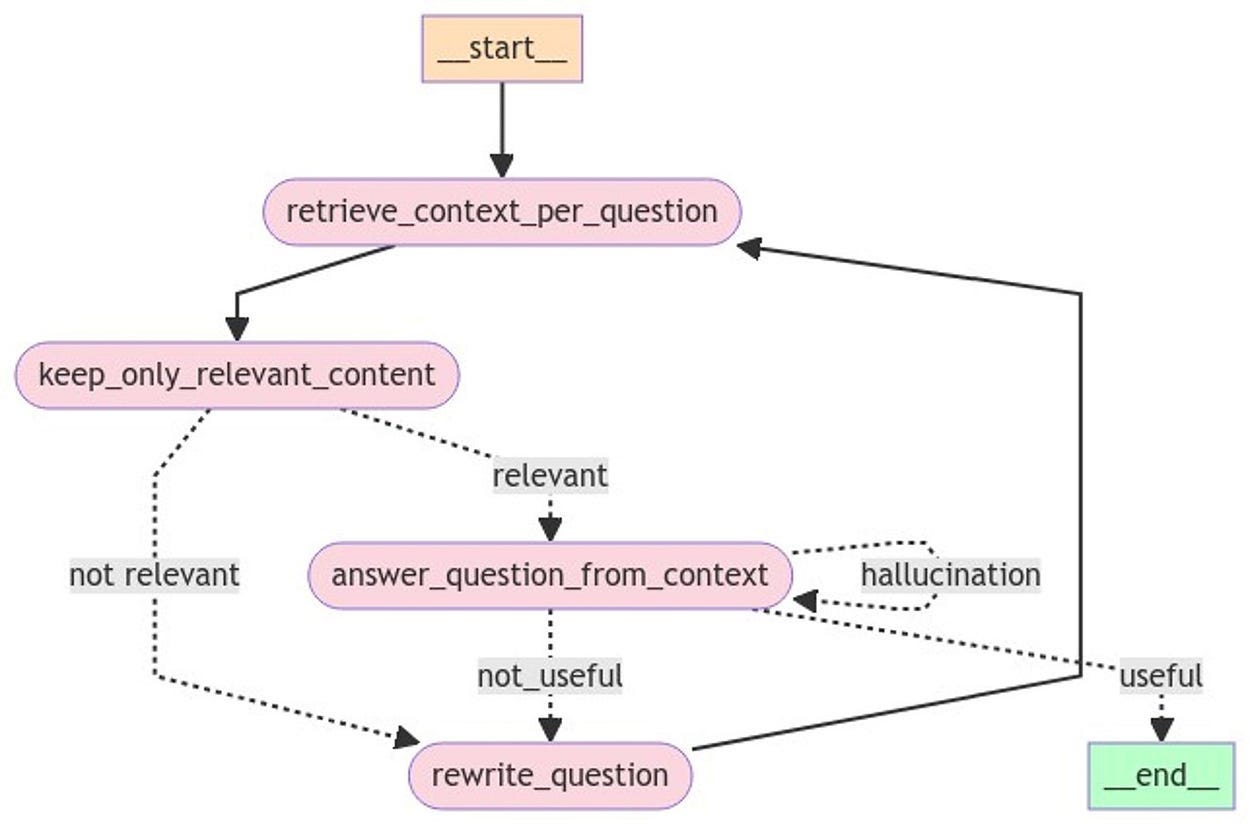 Iteration: The rewritten question is sent back to the context retrieval step, and the process repeats until a satisfactory answer is produced.