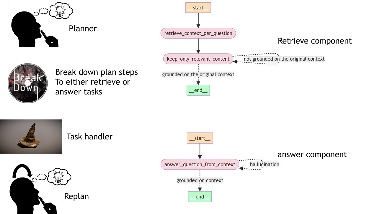 The answer is evaluated for hallucinations and checked to ensure it is grounded in the provided context.Replanning Phase: