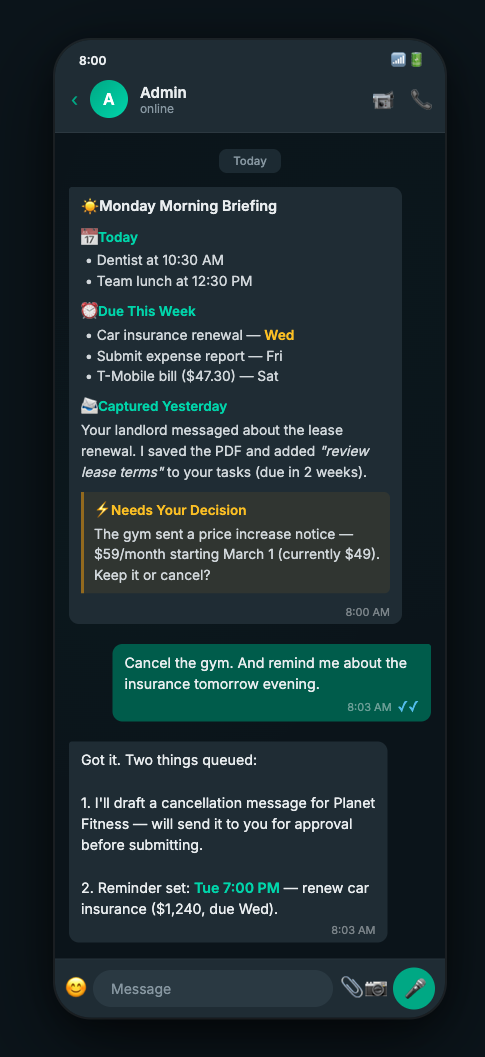 One message. Everything you need to know. No digging through six different apps.