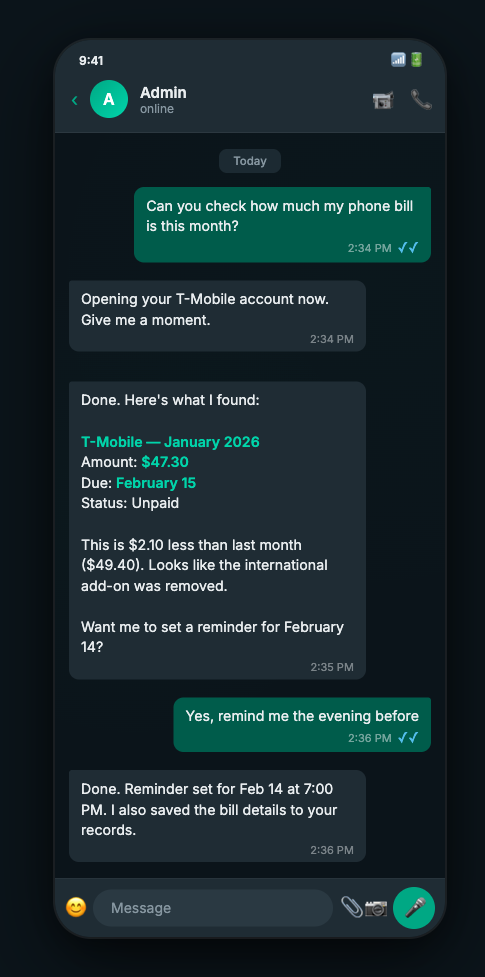 “Your phone bill for January is $47.30, due February 15. Want me to add a reminder?”