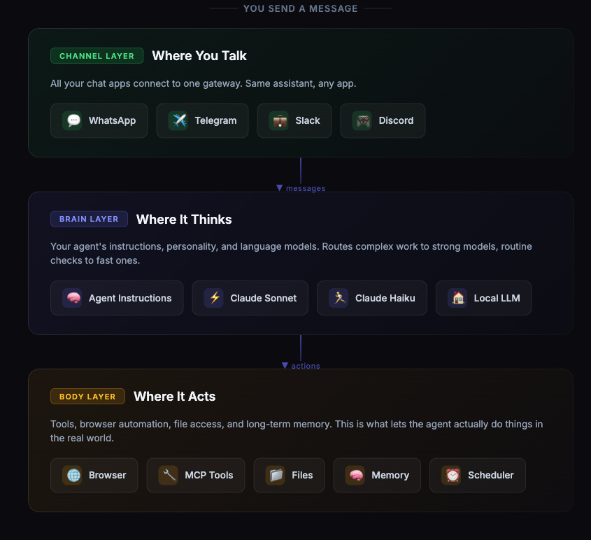 Body layer. Tools, browser automation, file access, and long-term memory live here. This is what lets the agent actually do things.