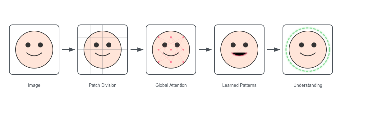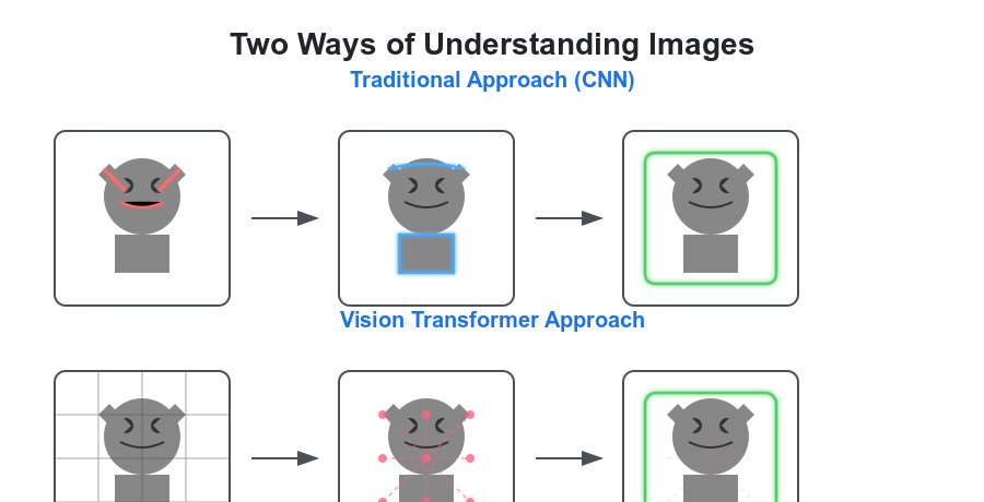 This approach marked a significant departure from the CNN-dominated paradigm that had defined computer vision for nearly a decade. While CNNs excel at capturing local patterns through their hierarchical structure of convolutions and pooling, ViTs offered a fundamentally different way of understanding images - one based on global relationships and attention mechanisms.